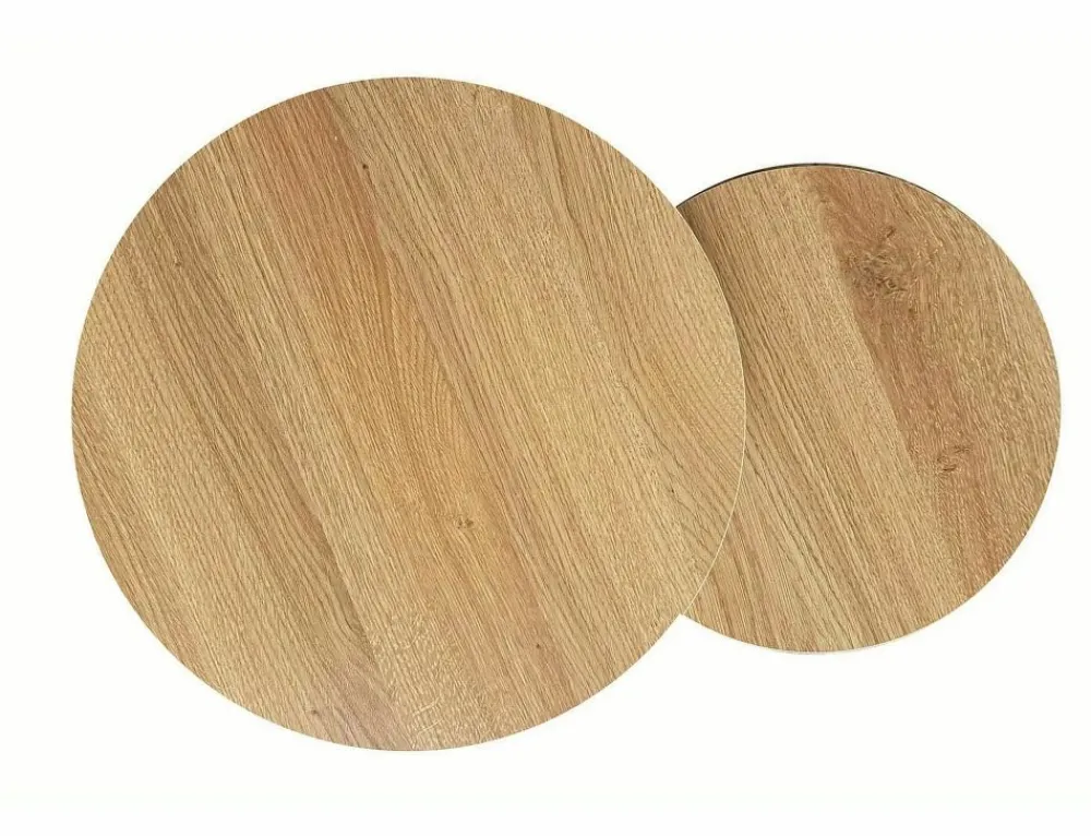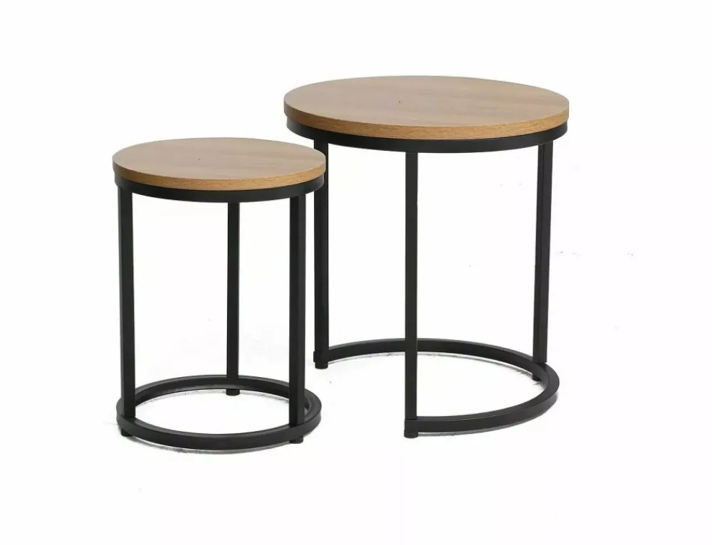 Zestaw ław, blat: płyta laminowana, stelaż: metal, kolor: dąb / czarny mat. Wymiary mniejszego stolika: średnica 35; wysokość: 42cm.