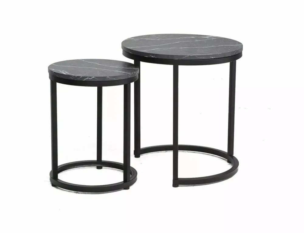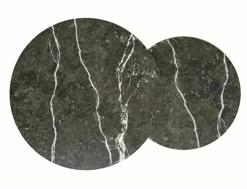 Zestaw ław, blat: płyta laminowana, stelaż: metal, kolor: czarny, efekt marmuru / czarny mat. Wymiary mniejszego stolika: średnica 32; wysokość: 42cm.