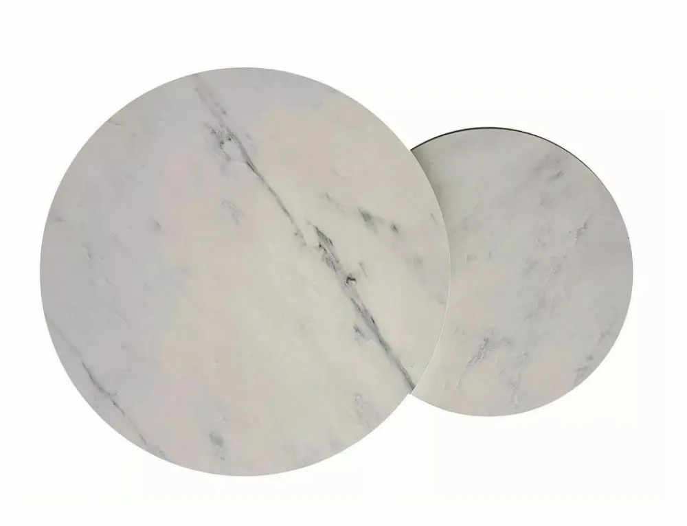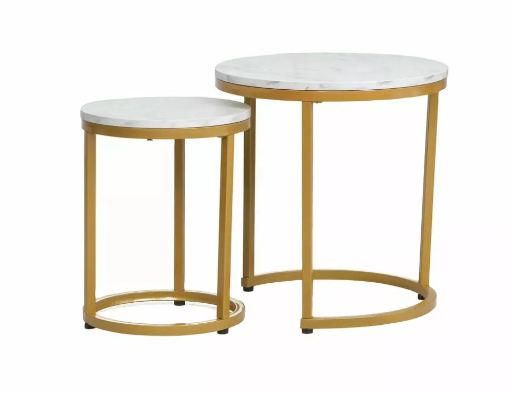 Zestaw ław, blat: płyta laminowana, stelaż: metal, kolor: biały, efekt marmuru / złoty. Wymiary mniejszego stolika: średnica 32; wysokość: 42cm.