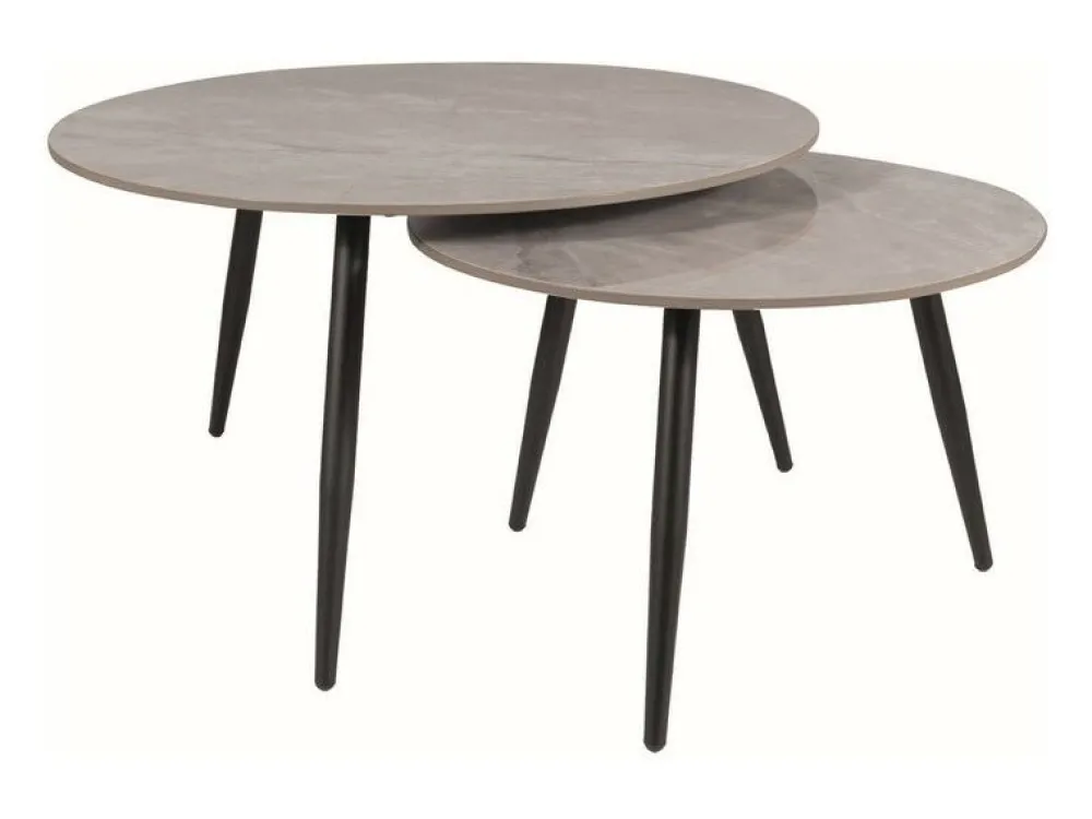 Zestaw ław, blat: ceramika, stelaż: metal, kolor: szary / czarny mat. Wymiary mniejszego stolika: średnica 60; wysokość: 40cm.