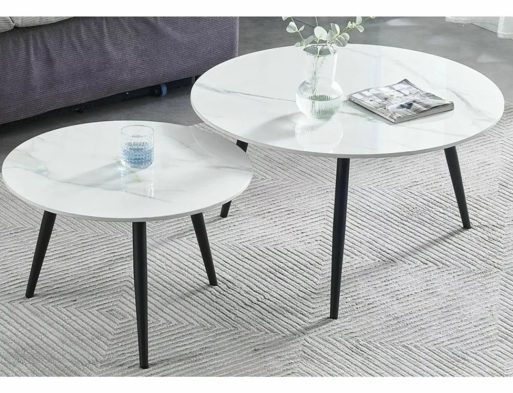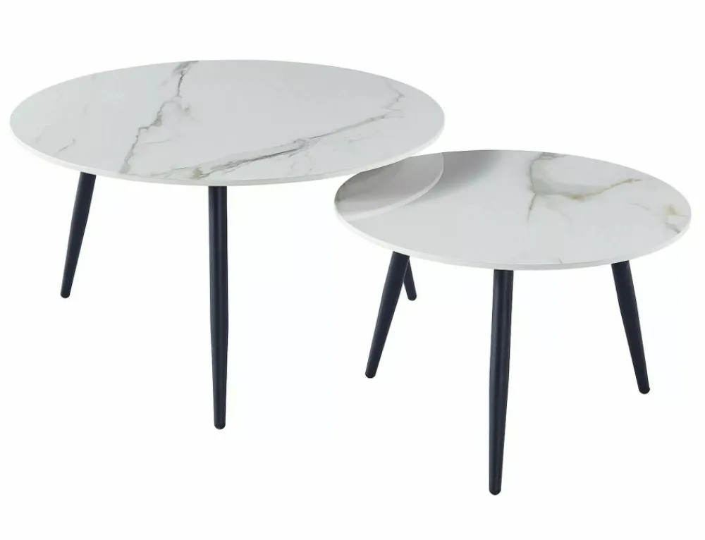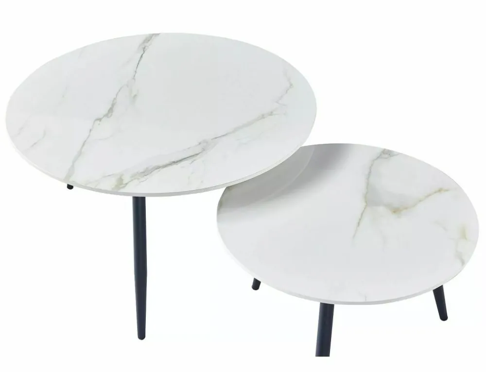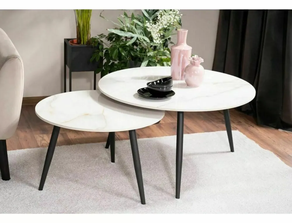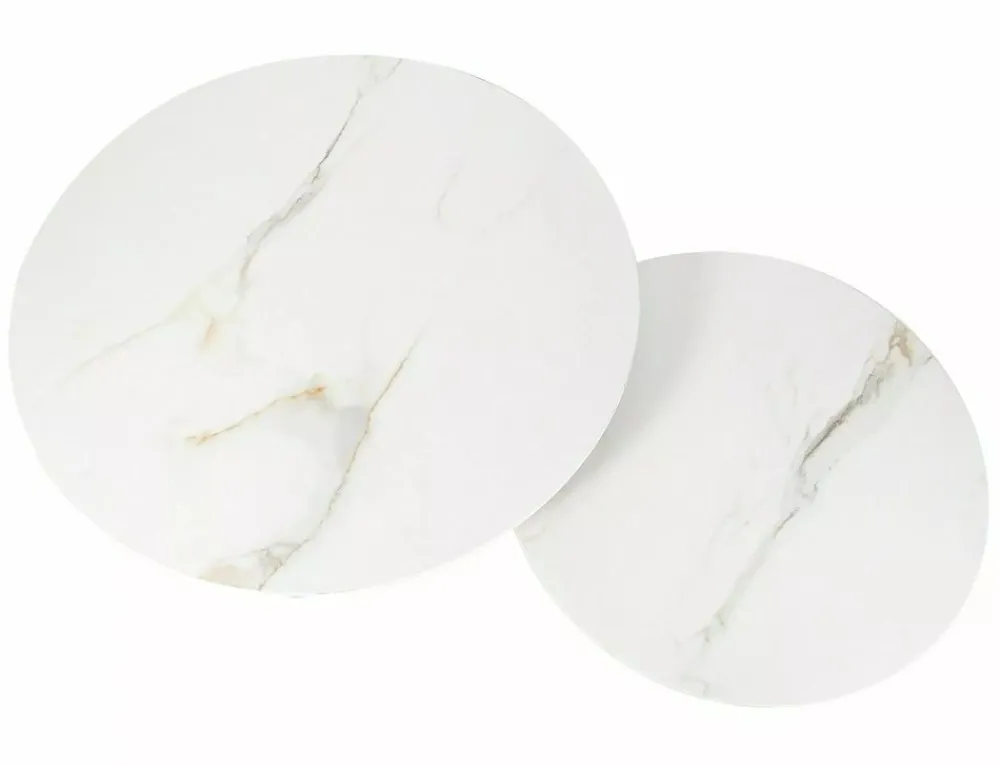 Zestaw ław, blat: ceramika, stelaż: metal, kolor: biały, efekt marmuru / czarny mat. Wymiary mniejszego stolika: średnica 60; wysokość: 40cm.