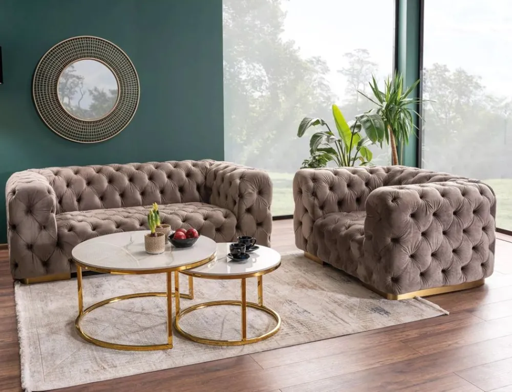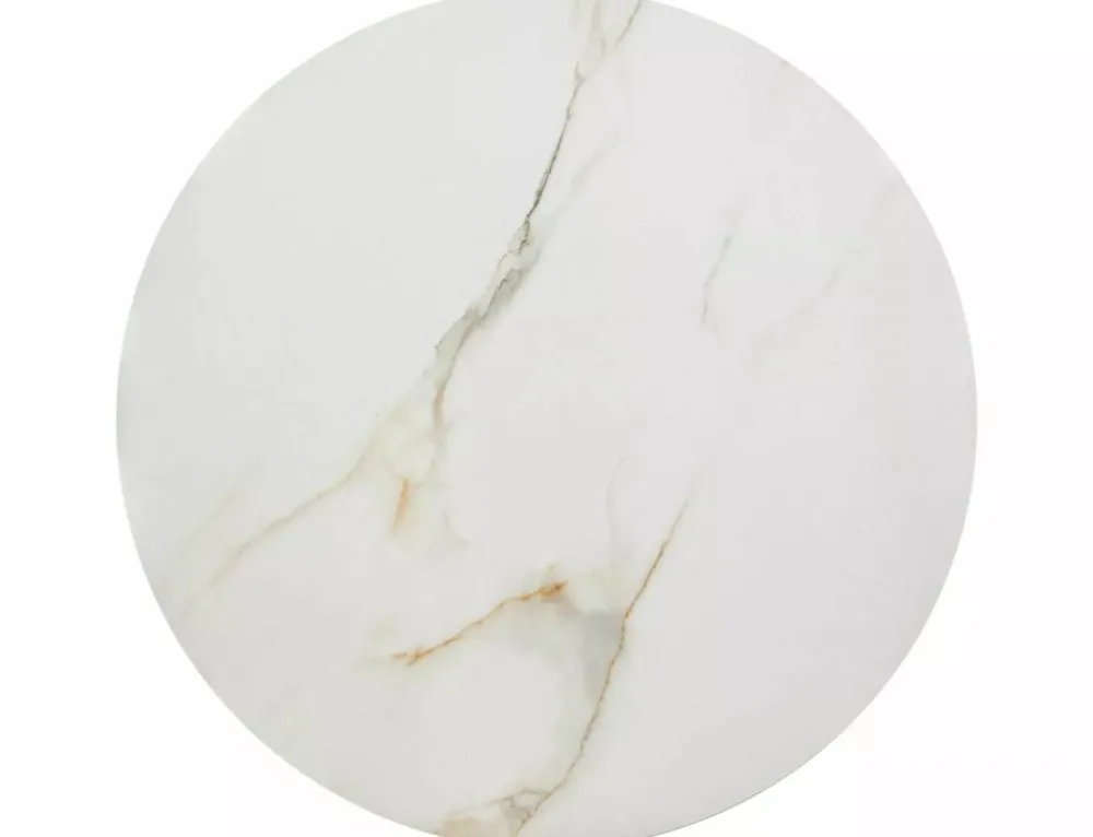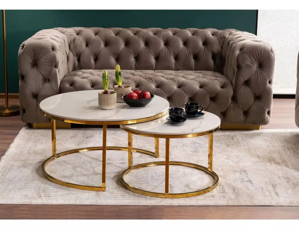 Zestaw ław, blat: ceramika, stelaż: stal nierdzewna, kolor: biały, efekt marmuru / złoty. Wymiary mniejszego stolika: średnica 60; wysokość: 38cm.