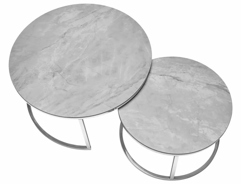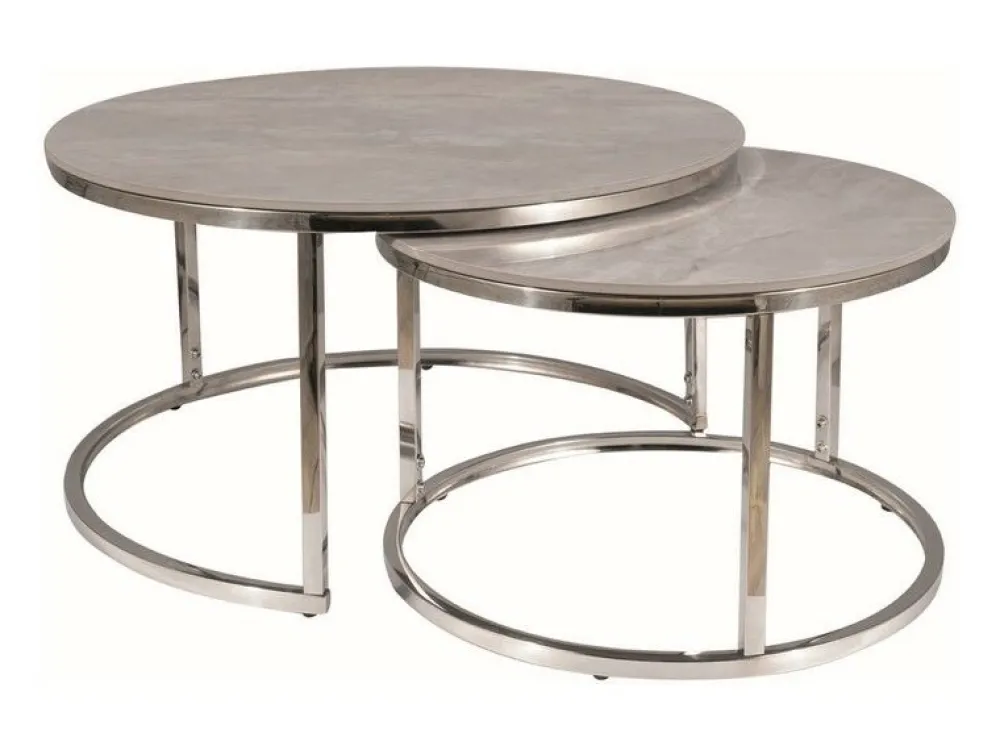 Zestaw ław, blat: ceramika, stelaż: stal nierdzewna, kolor: szary / chrom. Wymiary mniejszego stolika: średnica 60; wysokość: 38cm.