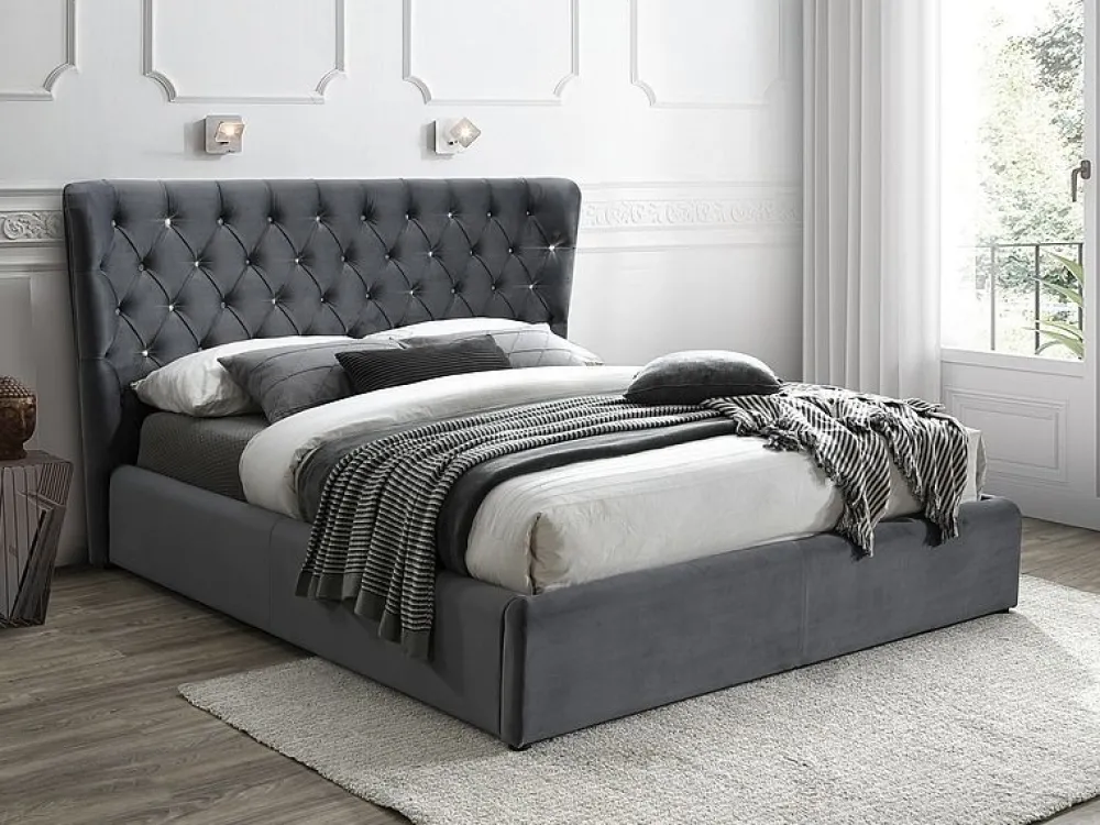 Łóżko, tkanina aksamit, kolor: szary, tap. Bluvel 14. Łóżko zawiera w komplecie stelaż z listew giętych osadzonych w elastycznych uchwytach. Wymiar materaca 160x200cm (cena bez materaca).