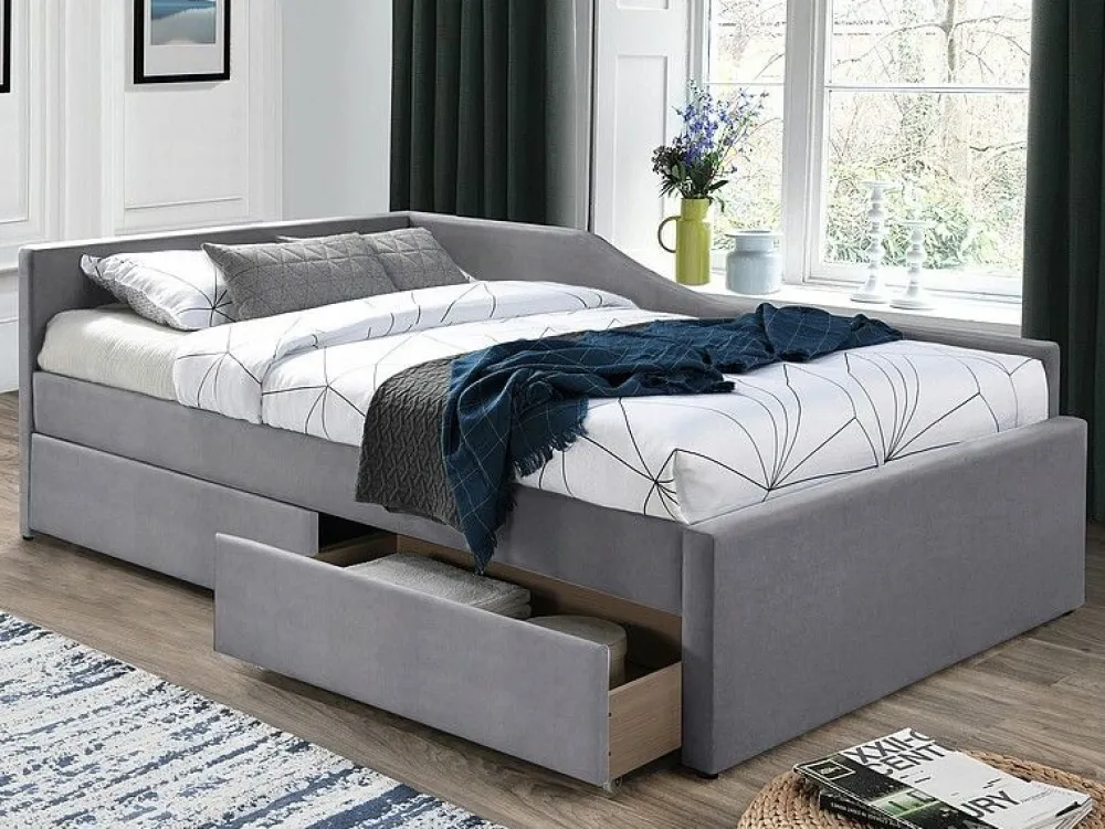 Łóżko z dwoma szufladami, tkanina, kolor: szary, tap.142. W komplecie stelaż z drewnianych listew. Rozmiar materaca: 120x200cm (cena bez materaca). Uwaga: zagłówek po lewej stronie (brak możliwości odwrotnego montażu).