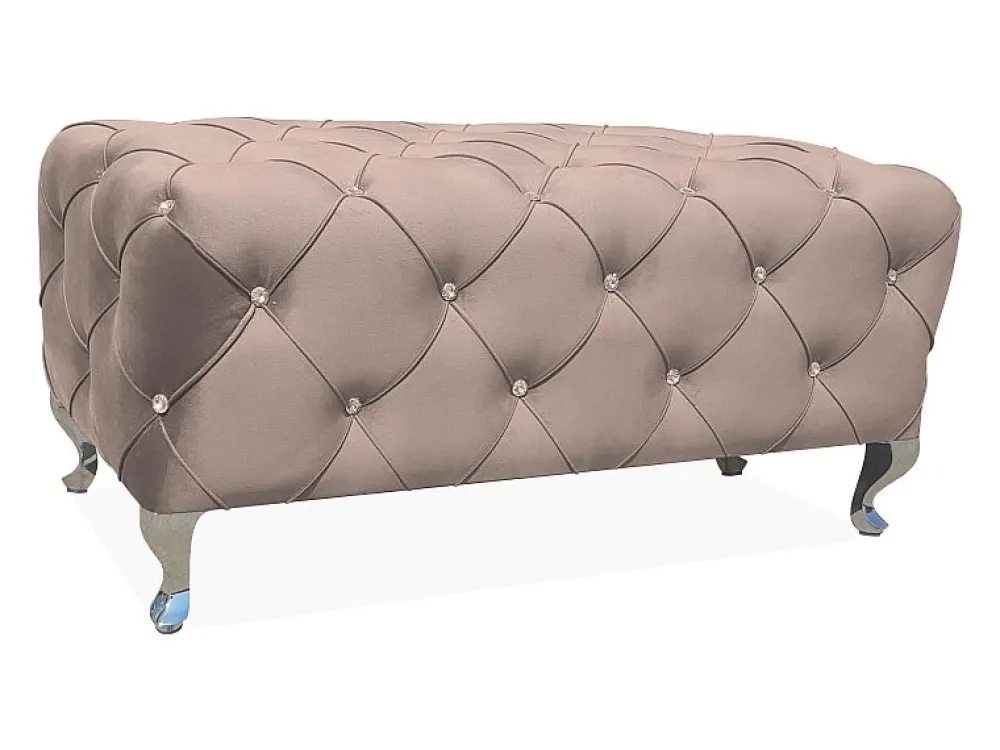 Puf / ławka, tkanina aksamit: beżowy BLUVEL 28 / nogi: metal, kolor: srebrny. Ilość kryształków (guzików): 54 szt., wysokość nóżek: 14 cm