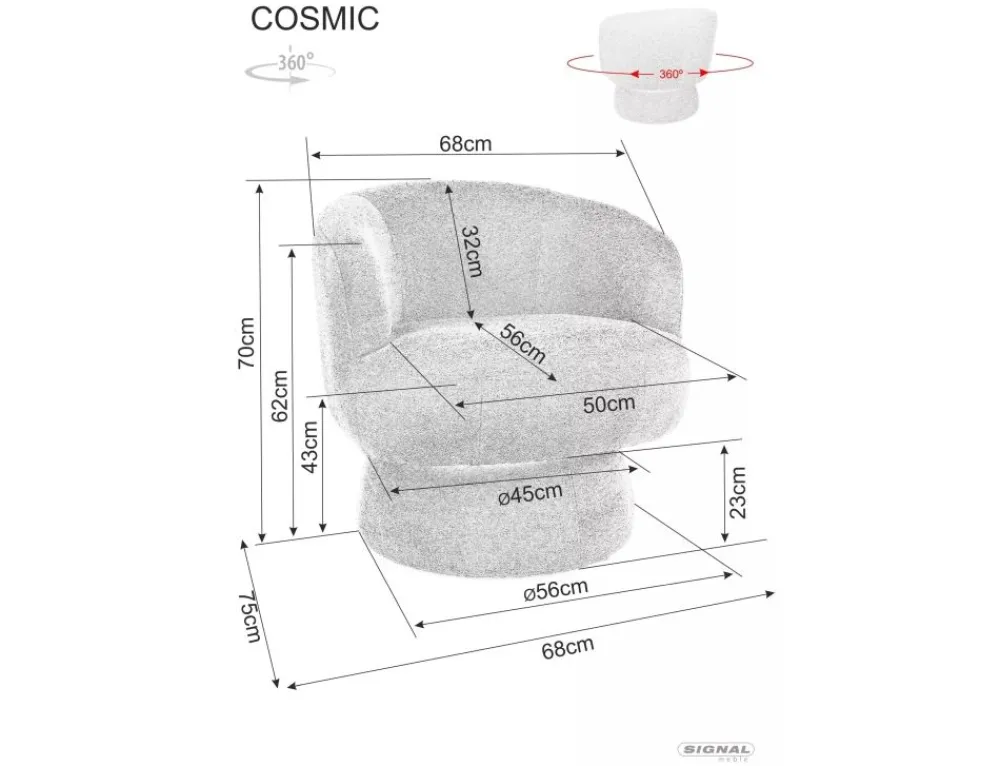 Wymiary fotela: A – 70, B – 68, C – 43, D – 56, E – 75, F – 23 cm