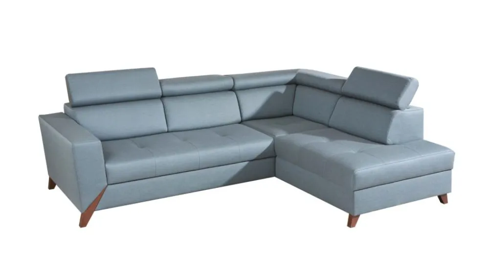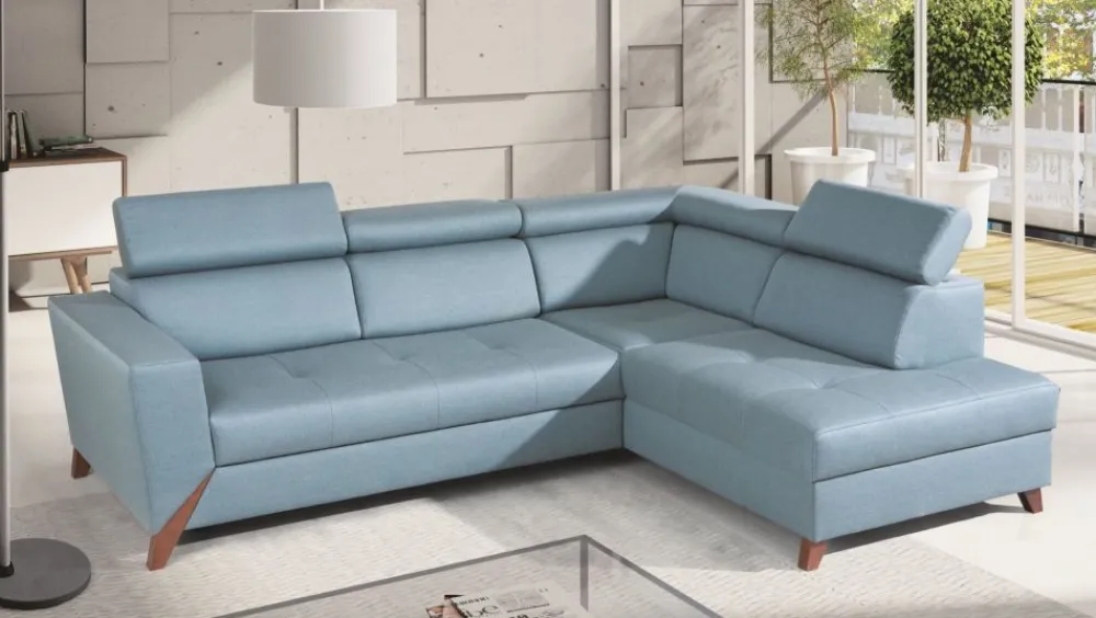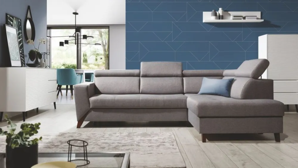 Model Salsa to stylowy narożnik z praktycznymi, regulowanymi zagłówkami. Nowoczesna forma mebla oraz oryginalne połączenie boku z drewnianą nogą sprawdzi się zarówno w tradycyjnych, jak i nowoczesnych aranżacjach. Narożnik z funkcją spania (funkcja delfin) oraz z pojemnikiem na pościel mieszczącym się w otomanie mebla. Zastosowane w wypełnieniu połączenie sprężyn falistych oraz pianki wysokoelastycznej jest gwarancją pełnego komfortu odpoczynku. W wypełnieniu oparcia zastosowana równie komfortową wyprofilowana pianka poliuretanowa w połączeniu z pasami elastycznymi. Regulacja wysokości w zakresie: 85-99 cm. Kanapa wykonana z dbałością o szczegóły. W kolekcji dostępne również sofy w dwóch wielkościach i fotel.