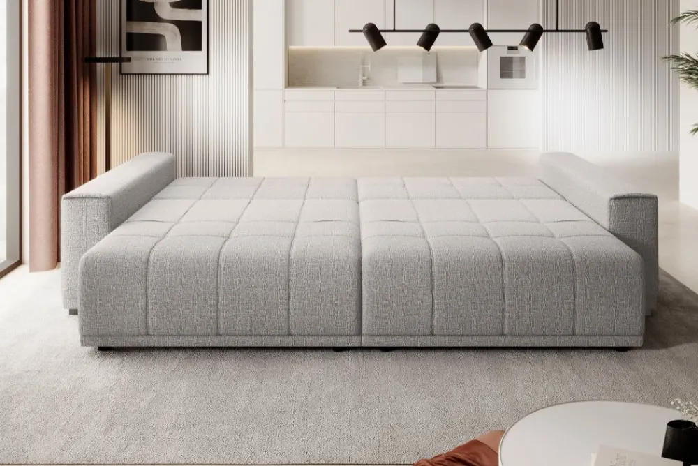 Sofa Motta została wyposażona w praktyczny system rozkładania DL podwójny, dzięki czemu w kilka chwil zamienia się w pełnowymiarowe łóżko. Powierzchnia spania 175 x 278 cm sprawia, że doskonale sprawdza się również jako miejsce do codziennego użytku. System działa lekko i płynnie, co ułatwia rozkładanie mebla nawet osobom starszym czy dzieciom. Rozkładana sofa Motta to świetne rozwiązanie do mieszkań, w których funkcjonalność idzie w parze z designem. Dzięki temu mebel z powodzeniem może pełnić rolę łóżka w salonie, pokoju gościnnym lub kawalerce. To doskonały wybór dla tych, którzy potrzebują kanapy z funkcją spania, która nie odbiega stylistycznie od nowoczesnego wnętrza.
