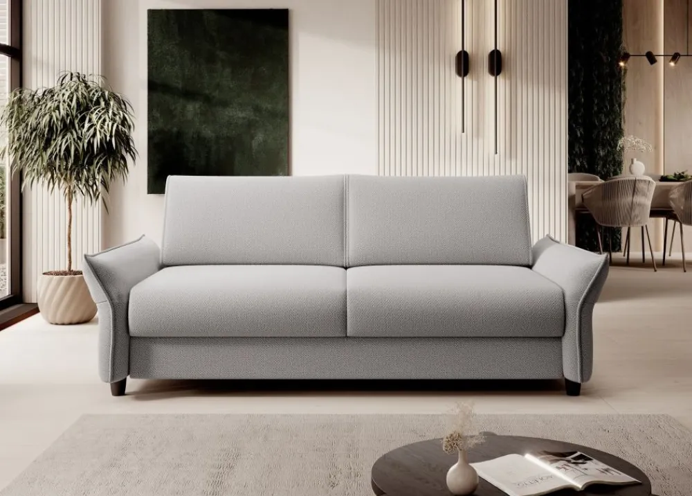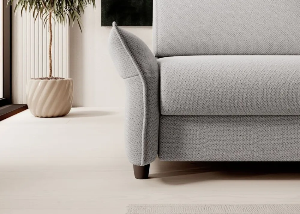 Elegancka bryła tej kanapy emanuje stylem i klasą, natomiast lekko odchylone podłokietniki dodają nuty wygody, zapewniając idealne wsparcie dla relaksu po długim dniu. Poza tym, niskie nóżki podkreślają lekkość konstrukcji, nadając całości lekki, nowoczesny charakter.