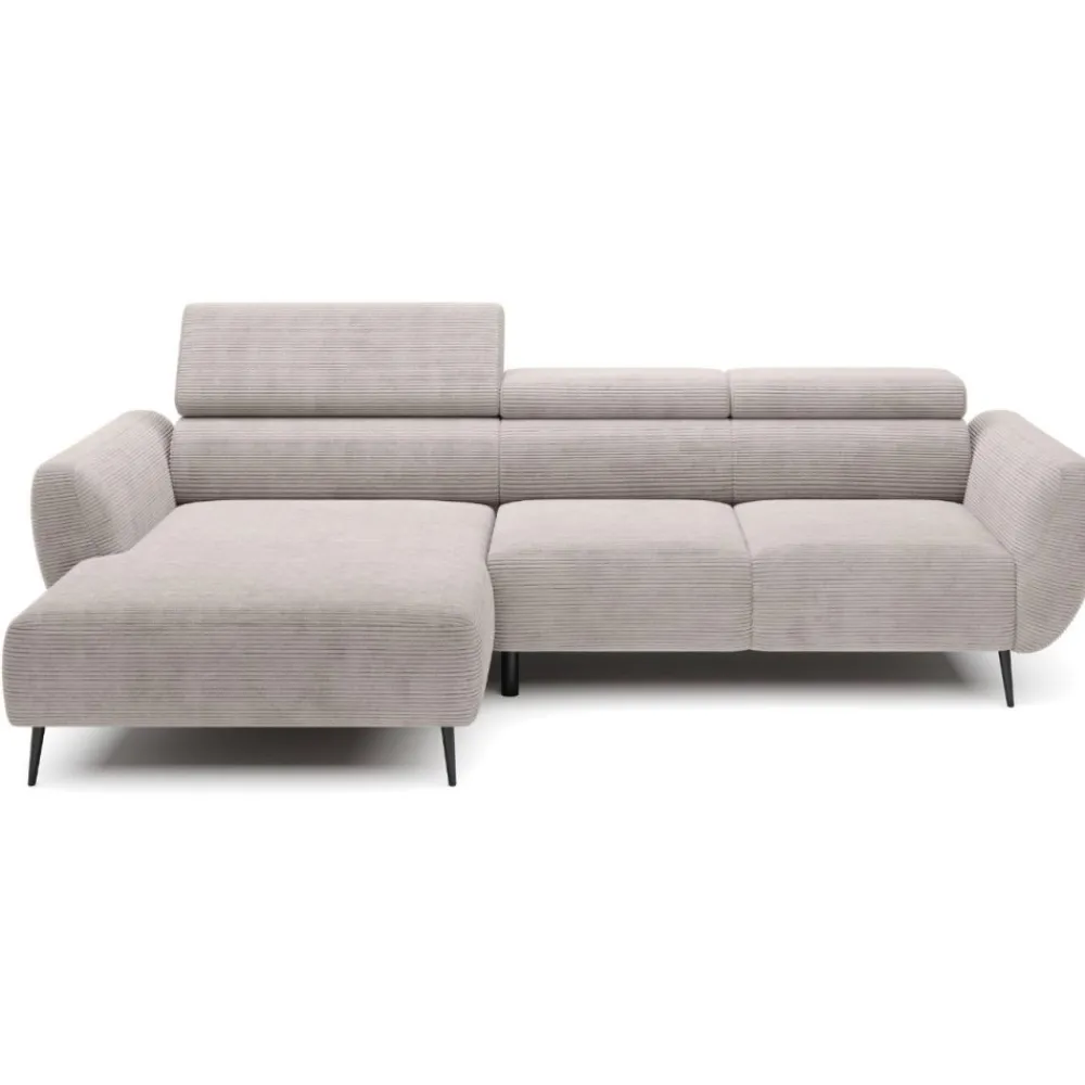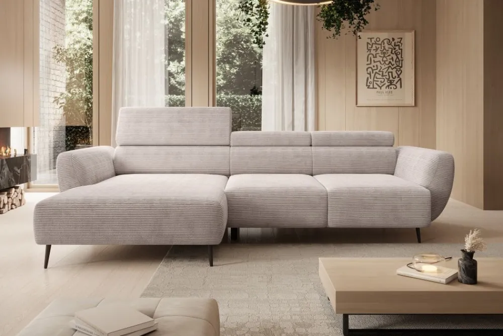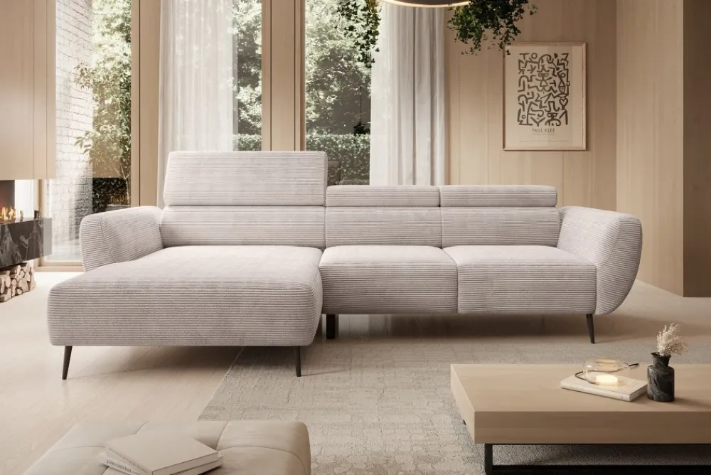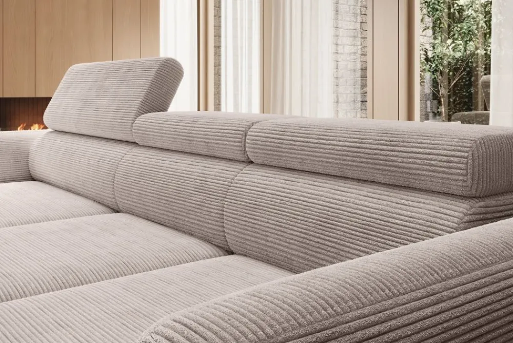 Alisson to również narożnik z regulowanymi zagłówkami, co oznacza indywidualne dopasowanie podparcia dla głowy i szyi każdego użytkownika. Trzy niezależnie ustawiane zagłówki zwiększają ergonomię mebla, poprawiając komfort siedzenia oraz pomagając utrzymać właściwą postawę ciała. To rozwiązanie, które pokochają osoby spędzające długie godziny na kanapie – zarówno podczas relaksu, jak i pracy z laptopem. Ruchome zagłówki dyskretnie wpisują się w linię mebla, nie zaburzając jego minimalistycznego charakteru. Całość tworzy spójną formę, która doskonale prezentuje się z każdej strony. To nie tylko komfort, ale też nowoczesny akcent w Twoim wnętrzu.