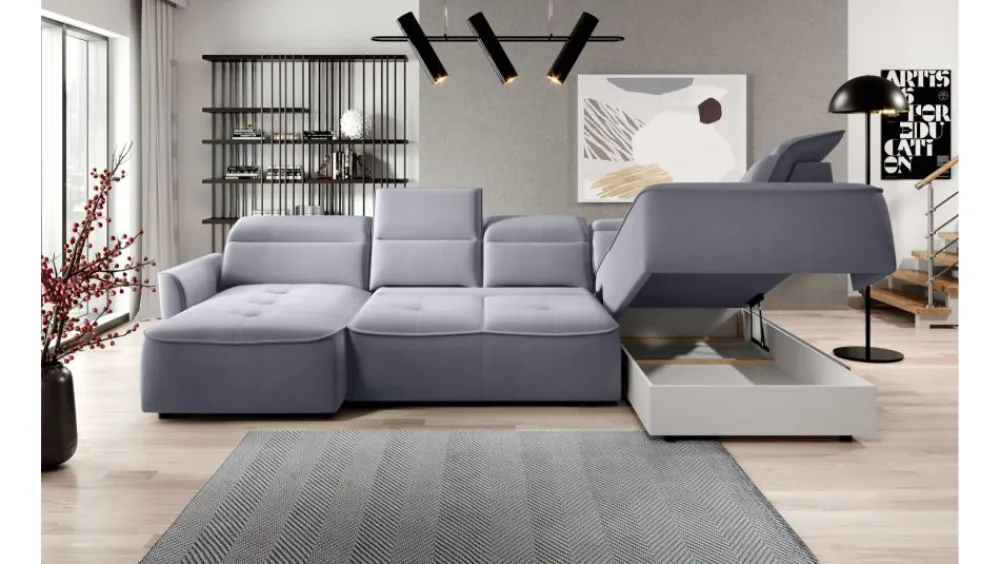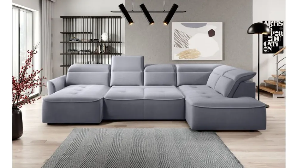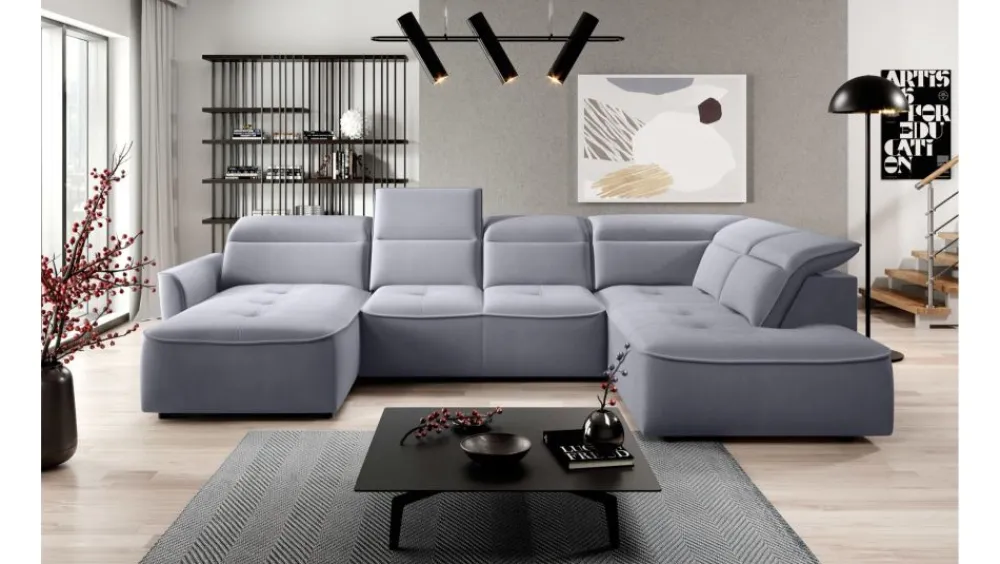 Narożnik Murillo z pewnością przypadnie Ci do gustu. Innowacyjne zastosowanie dużego wysuwu funkcji relaks, idealnie sprawdzi się w przypadku okazjonalnego wykorzystania narożnika do spania. Kolejnym plusem wypoczynku jest ukryty w otomanie pojemnik na pościel. Mebel jest niezwykle wygodny, a dzięki możliwości regulowania wysokości zagłówków sprawi, że Twój wypoczynek będzie jeszcze bardziej przyjemny. Klasyczne, opływowe kształty idealnie wkomponują narożnik w każdy styl pomieszczenia.