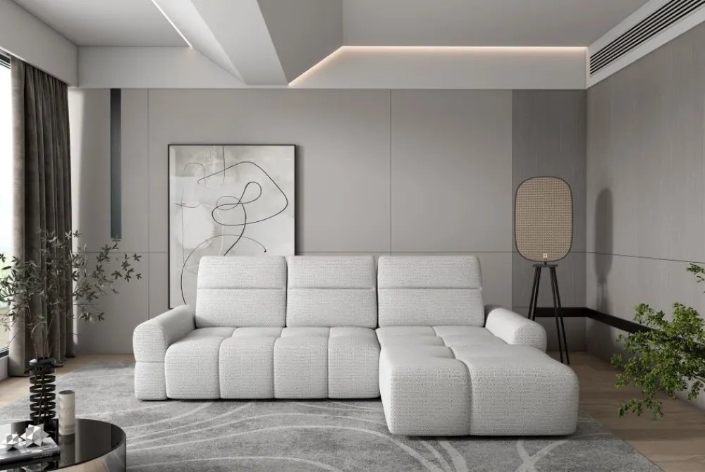 Estetyka narożnika Mateo została dopracowana w każdym detalu – od miękkiej, przyjemnej w dotyku tkaniny, po symetryczne pikowania, które nadają mu przytulny, a zarazem designerski wygląd. Stylowe przeszycia nie tylko pełnią funkcję dekoracyjną, ale także zapewniają trwałość tapicerki. Narożnik z przeszyciami to doskonały wybór do nowoczesnych wnętrz, gdzie liczy się spójność formy i funkcji. Dzięki harmonijnym liniom i neutralnej kolorystyce, Mateo łatwo dopasować do różnych aranżacji. Mebel prezentuje się świetnie zarówno w dzień, jak i wieczorem przy klimatycznym oświetleniu. To więcej niż narożnik – to element stylu życia.