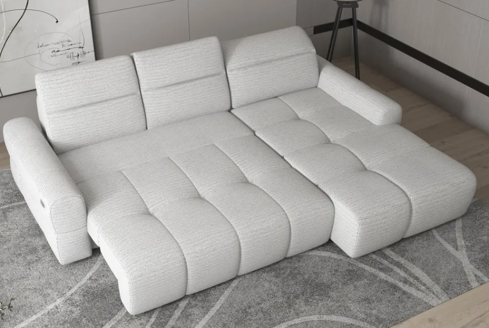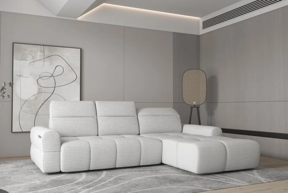 Narożnik Mateo to idealne rozwiązanie dla osób ceniących nowoczesne technologie i codzienny komfort. Dzięki elektrycznie regulowanej głębokości siedziska do aż 60 cm, dopasujesz pozycję odpoczynku idealnie do swoich preferencji. Taki mega wysuw gwarantuje wyjątkową wygodę zarówno podczas siedzenia, jak i leżenia. To narożnik elektryczny, który robi różnicę – bez kompromisów między funkcjonalnością a designem. Subtelne przeszycia na tapicerce podkreślają elegancki charakter mebla. Mateo świetnie sprawdzi się w przestrzeniach salonowych w stylu modern i minimalistycznym.