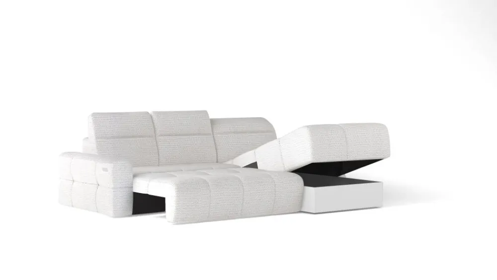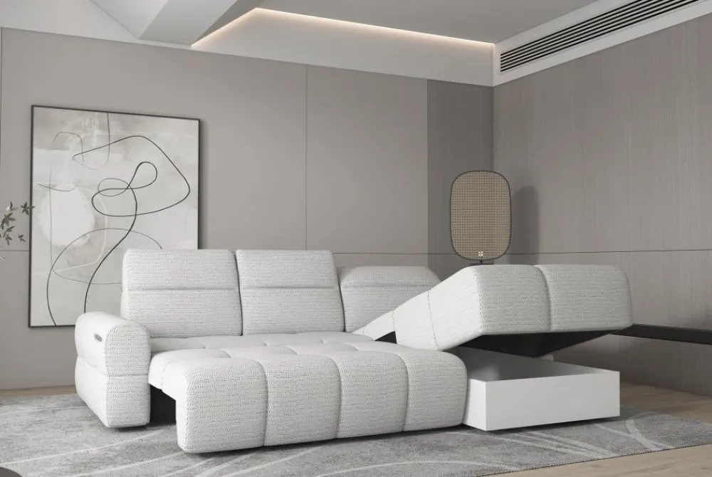 Mateo to nie tylko nowoczesny narożnik z elektrycznym wysuwem – to także praktyczne łóżko z powierzchnią spania 120 x 226 cm. Rozłożenie mebla jest proste i szybkie, a całość tworzy jednolitą, komfortową przestrzeń do wypoczynku. Dodatkowy pojemnik na pościel pozwala wygodnie przechować koce, poduszki czy prześcieradła, oszczędzając miejsce w szafach. Wypełnienie ze sprężyny falistej zapewnia optymalne podparcie zarówno podczas siedzenia, jak i snu. Narożnik z funkcją spania codziennego to doskonały wybór do salonów w małych mieszkaniach. Mateo łączy w sobie design, funkcjonalność i najwyższy standard wykonania.