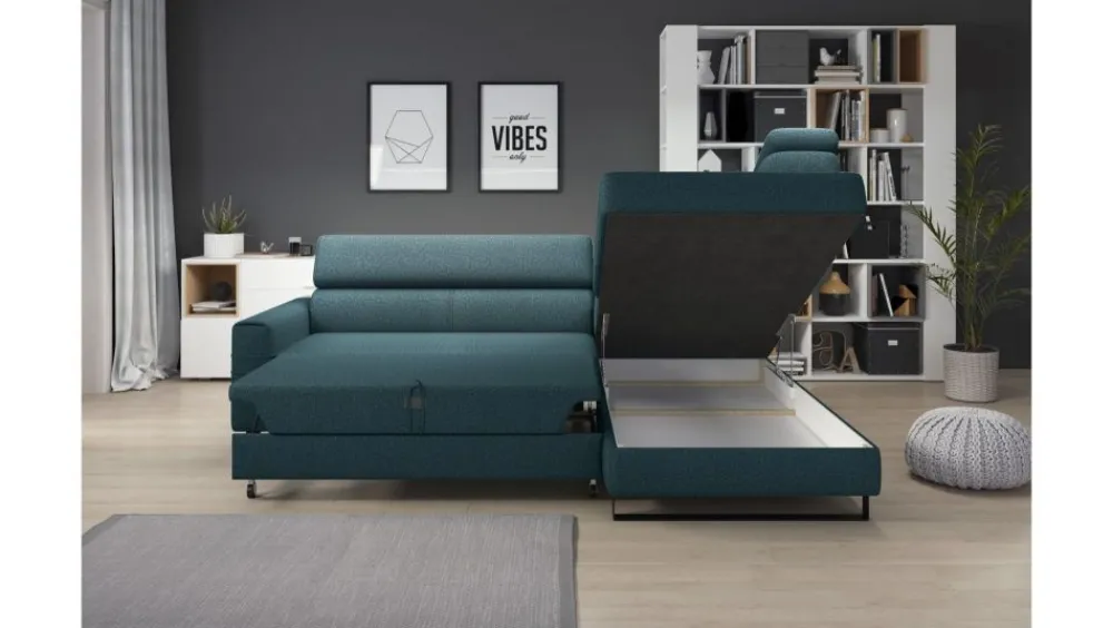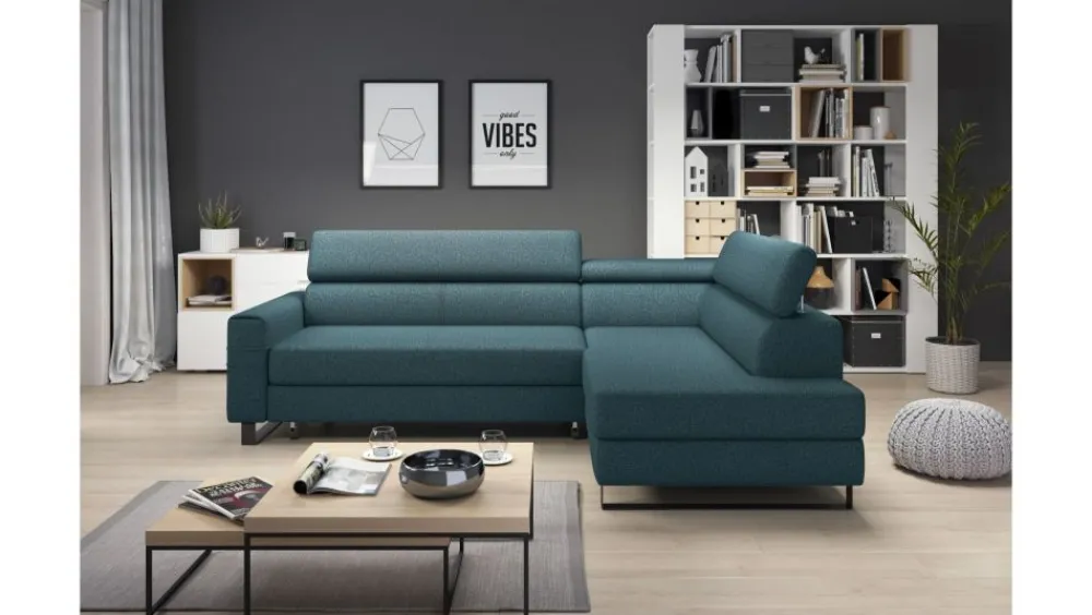 Narożnik Livio uwiedzie Cię swoim klasycznym kształtem oraz nowoczesnymi funkcjonalnościami. Posiada trzy ruchome zagłówki, dużą funkcję spania oraz pojemnik na pościel. Mebel osadzony na oryginalnych, wysokich czarnych nóżkach, dodających mu współczesnego charakteru
